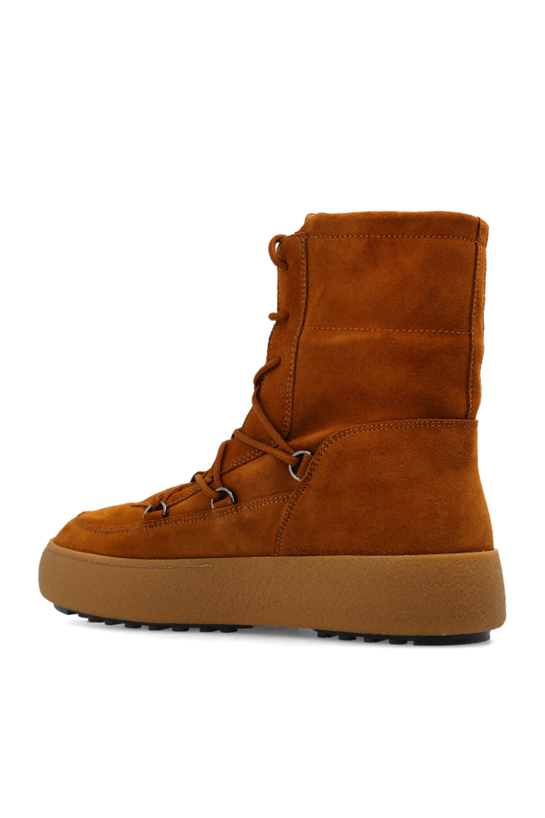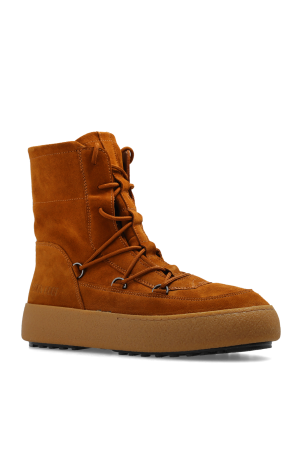 Brown ‘Mtrack’ snow boots from Moon Boot. Made of waterproof suede, this lace-up model showcases an embossed logo on the side and a light midsole with suction cups on a brown and black tread rubber sole to ensure good surface control.