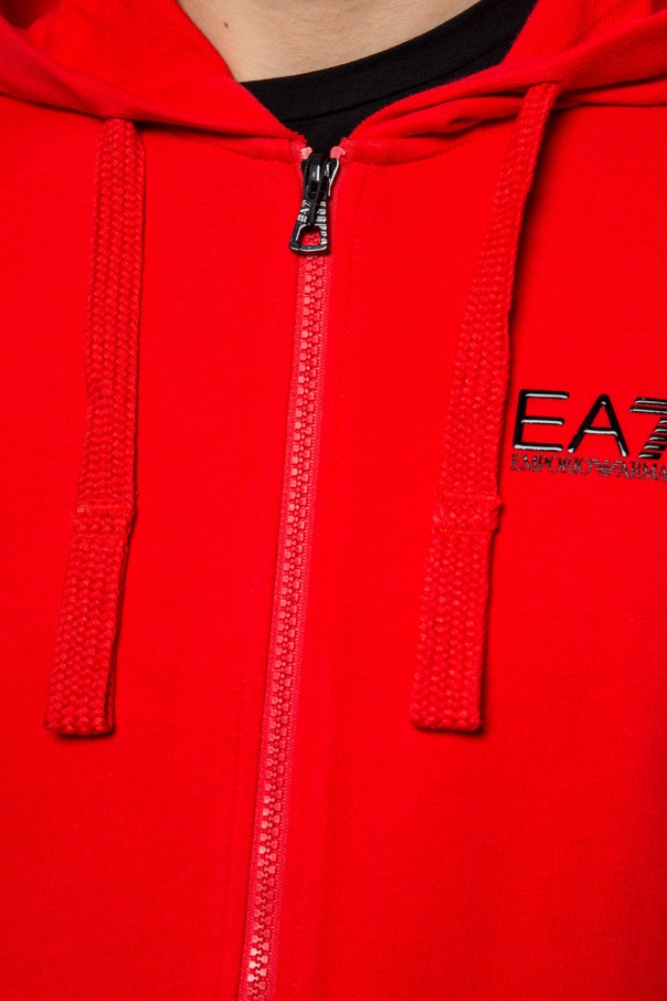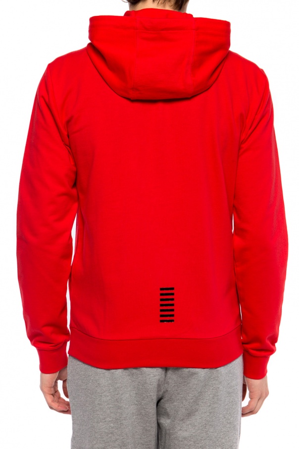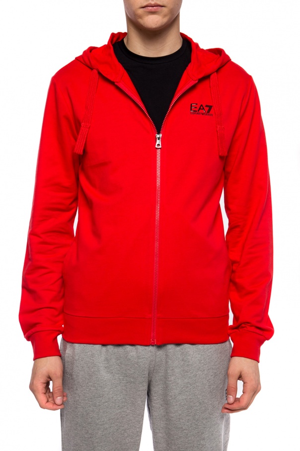 Red sweatshirt from EA7 Emporio Armani. Made of cotton. Zip fastening. Decorated with a black logo print. Two slip pockets on the front. Drawstring hood. Ribbed bottom hem and cuffs.