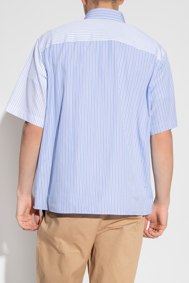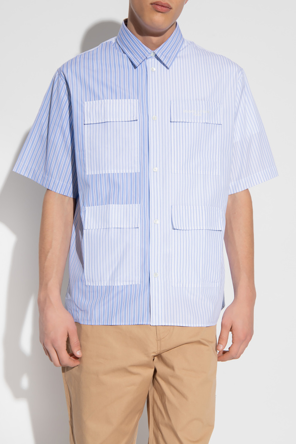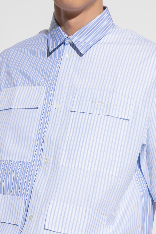 White and blue shirt from Maison Kitsune. Made of cotton, this style fastens with buttons and showcases a stripe pattern, logo embroidery and short sleeves.