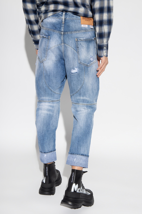 Light blue ‘Tailored Combat’ jeans from Dsquared2. Falling with tapered legs, this pair features button closures, classic five pockets, distressed detailing and turned-up cuffs.