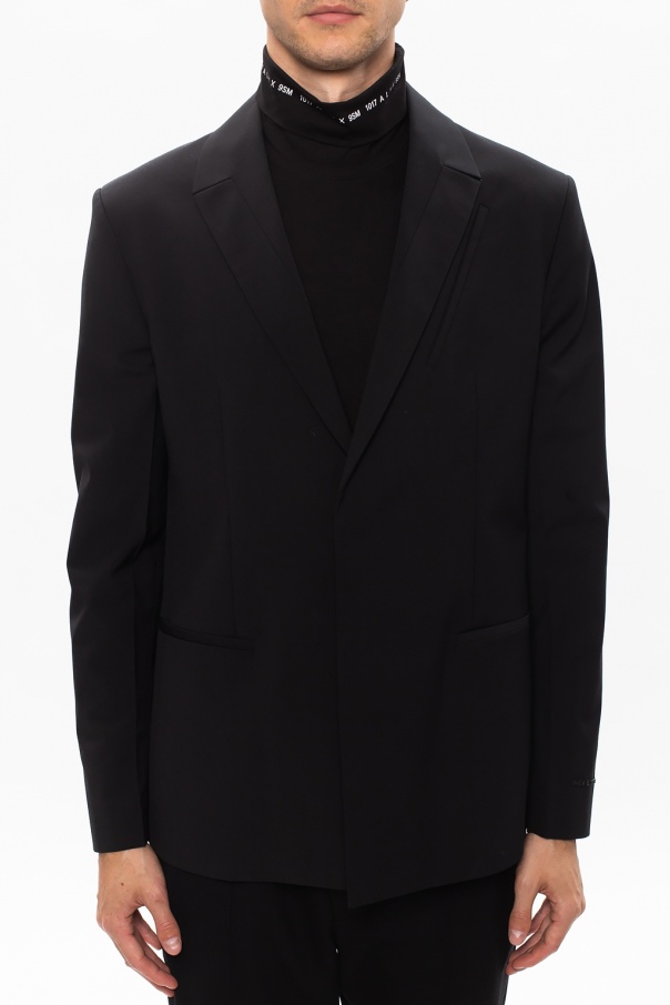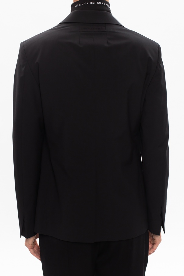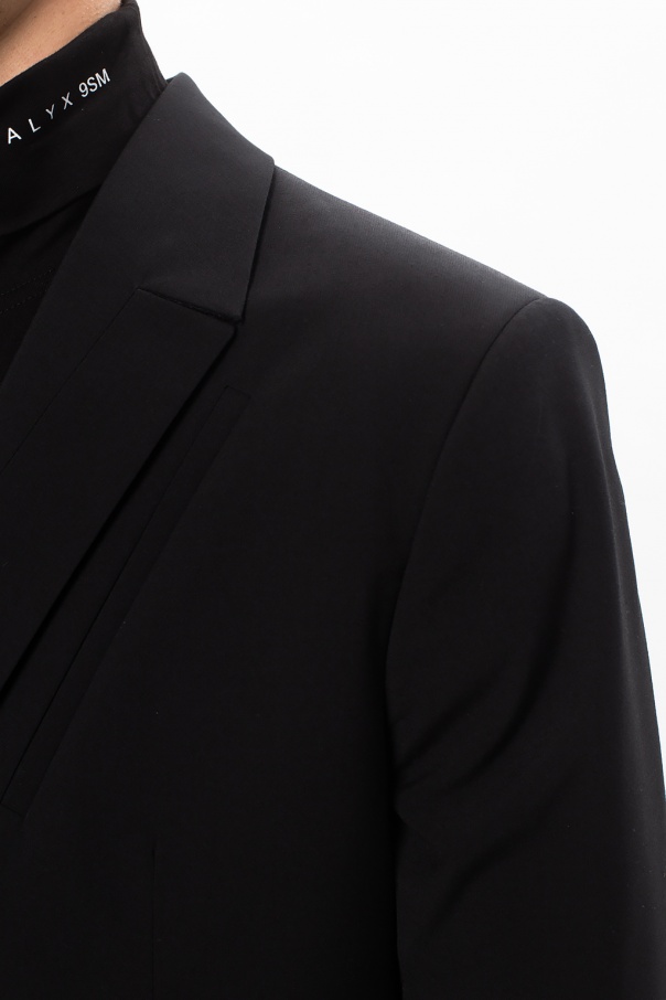 Black blazer from 1017 ALYX 9SM. Sporting metal logo plaque, this design was made of wool-blend fabric and is complete with single button closing, three slip pockets on the front and single vent on the back.