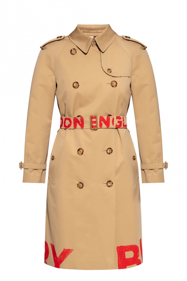 Beige coat from Burberry. Printed with the brand's logo in red, this item features hook and button fastenings, two button pockets on the front and an included belt to cinch the waist.