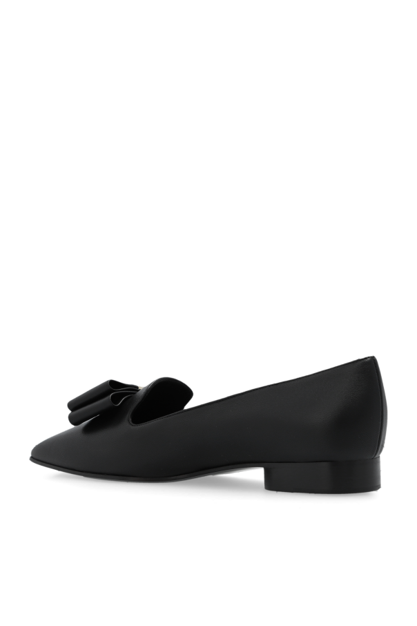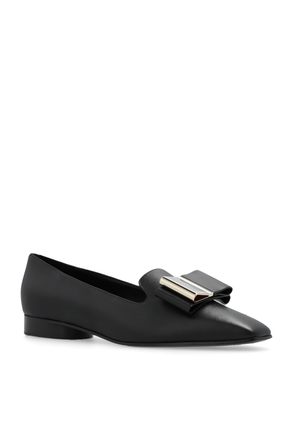 Black loafers from FERRAGAMO. Made of leather, this pair features a decorative bow with a gold-tone metal appliqué with an engraved logo on the front, tapered, square toe, black leather sole and standard width insole.