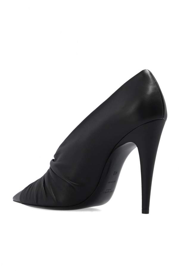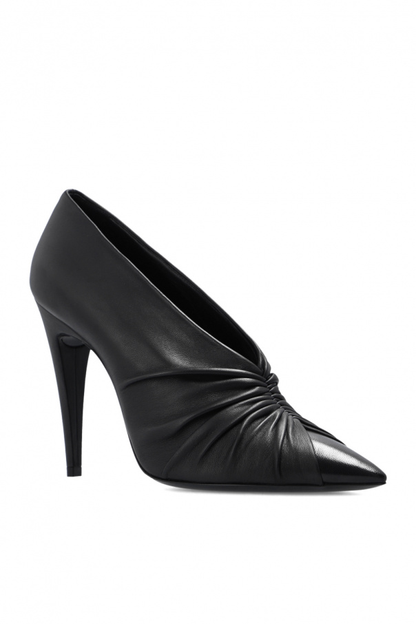 Black ‘Indya’ pumps from Saint Laurent. Made of lamb leather and sheep leather, this model features a pointed toe silhouette, a pleated ruching detail and a black leather sole.