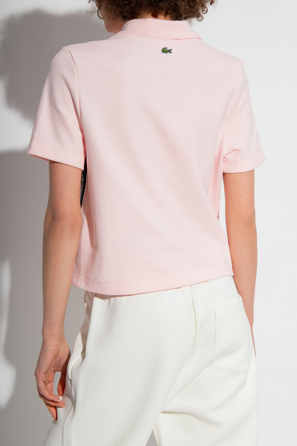 Light pink polo shirt from Lacoste. Crafted from organic cotton, this garment features a buttoned collar, multicolored logo patch, short sleeves and branded side stripes in black and white.