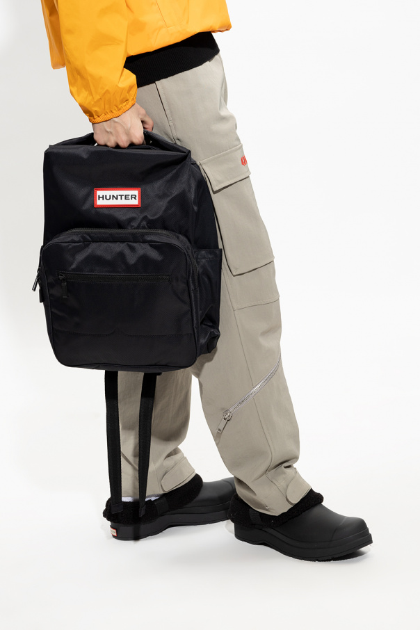 Black backpack from Hunter. Made of recycled fabric, this model is complete with a zip and snap fastening, logo patch in white, red and black, half-round handle, two slip pockets, two zip pockets, adjustable shoulder straps, black metal hardware and one internal compartment with one slip pocket.