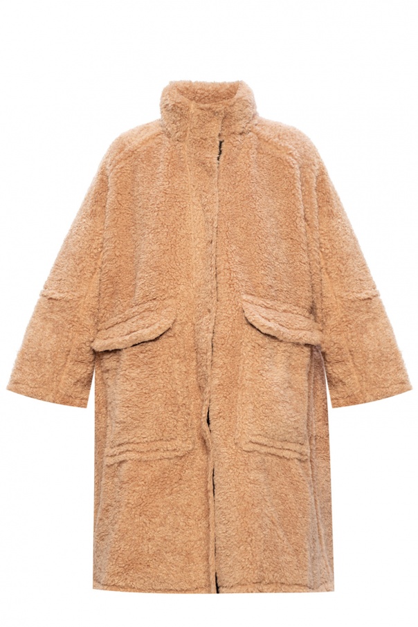 Brown reversible hooded coat from Diesel. Fastened with a two-way zip and snaps, this garment is lined with faux fur on one side with two snap-fastened flap pockets on the front and printed with a logo pattern in pink on the other side with two snap pockets on the front.