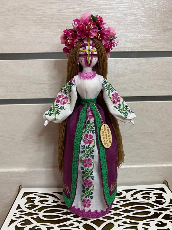 Размер 38 см, стоит на деревянной подставке, льняная одежда, ожерелье из стекла и бисера, волосы из шерсти, можно расчесывать, гибкие ручки, венчик из искусственных цветов.Состояние: НовоеЦвет:- Белый