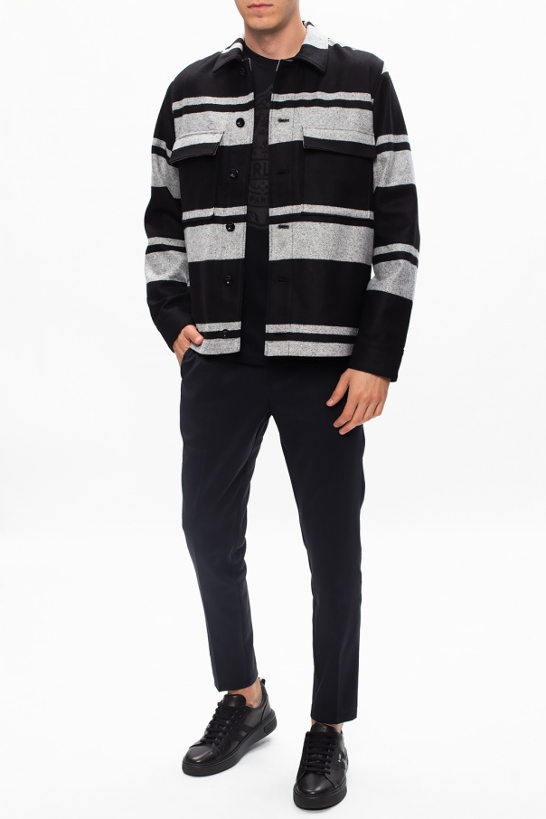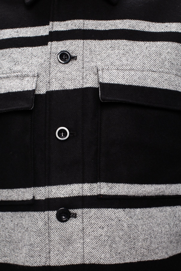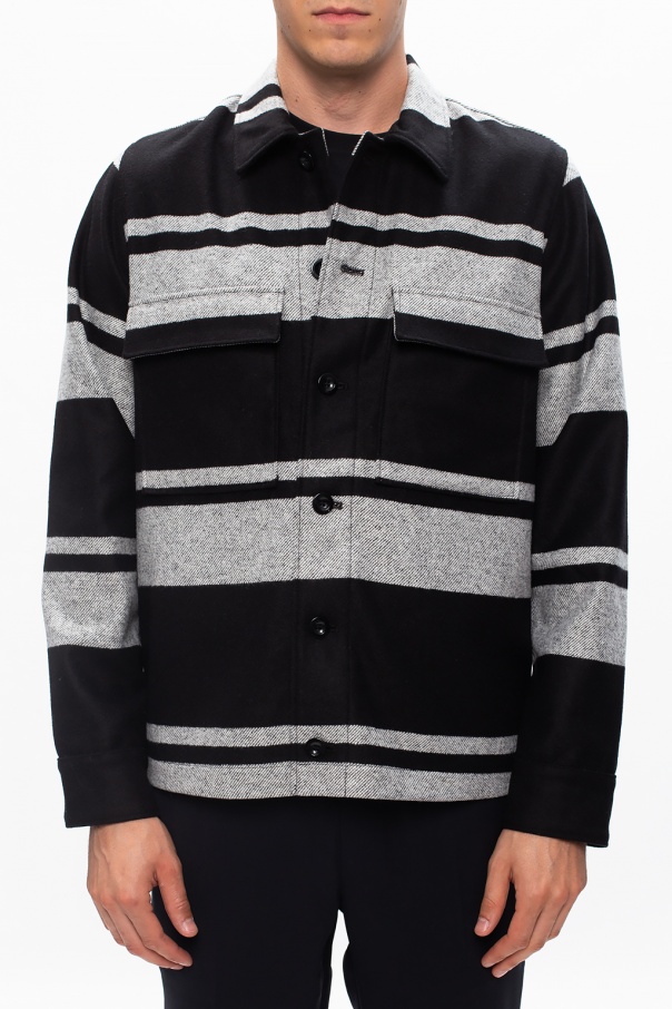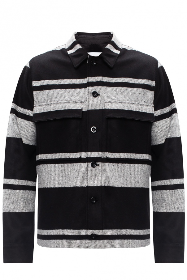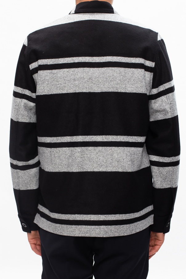 Black and grey shirt from Samsoe Samsoe. Illustrated with horizontal stripe pattern, this style fastens via buttons and employs a flap pocket on the chest.