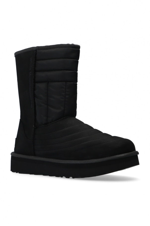Black 'The Classic' snow boots from UGG x White Mountaineering. Crafted from nubuck lined with wool, this quilted pair sits on a black treaded EVA foam sole and features exposed stitching details, dark grey logo print on the front and a black logo patch on the back.