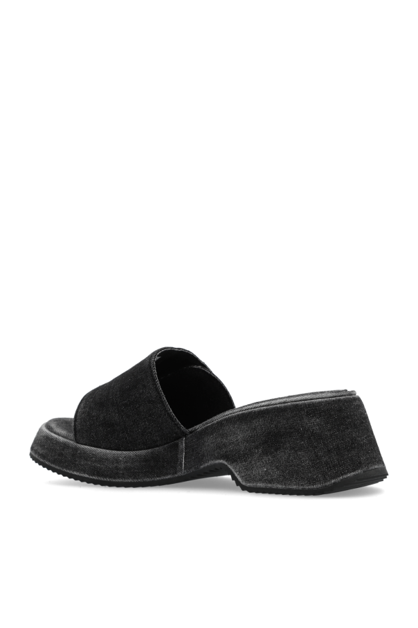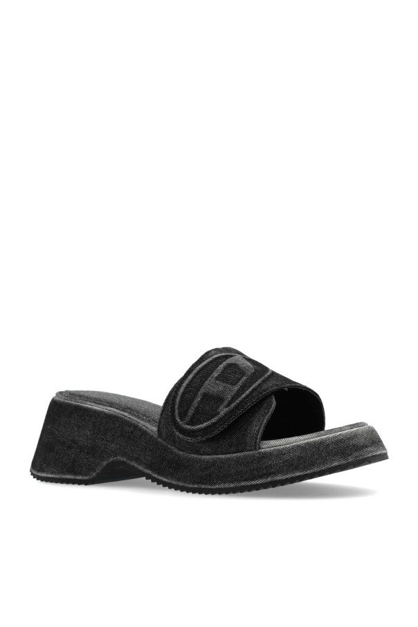 Black and grey ‘D SA-OVAL D PF’ denim wedge slides from Diesel. Fastened with velcro, this pair features a tactile logo and a black rubber sole.