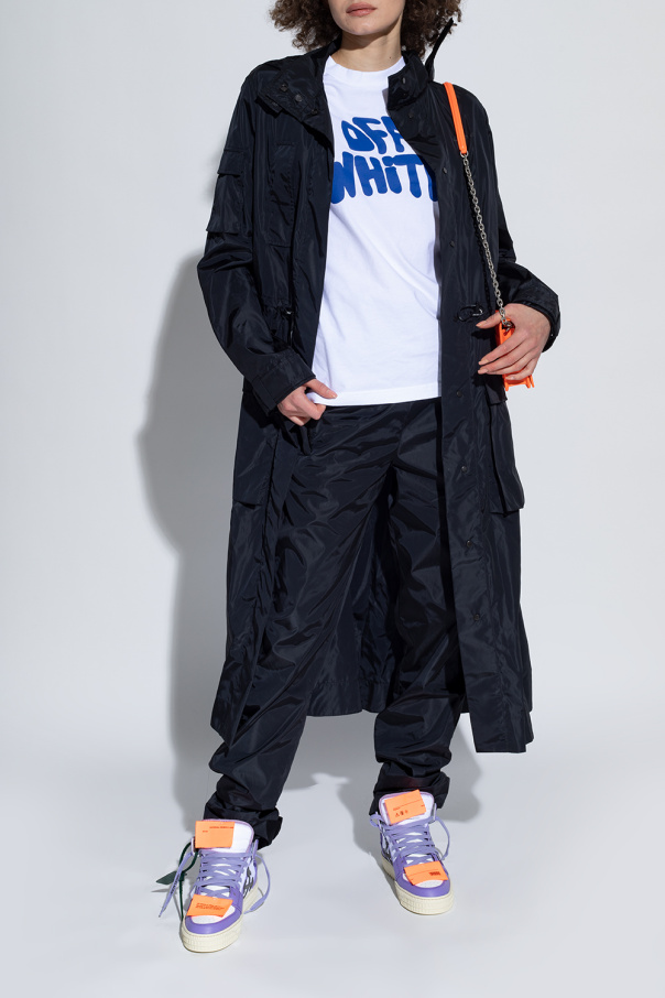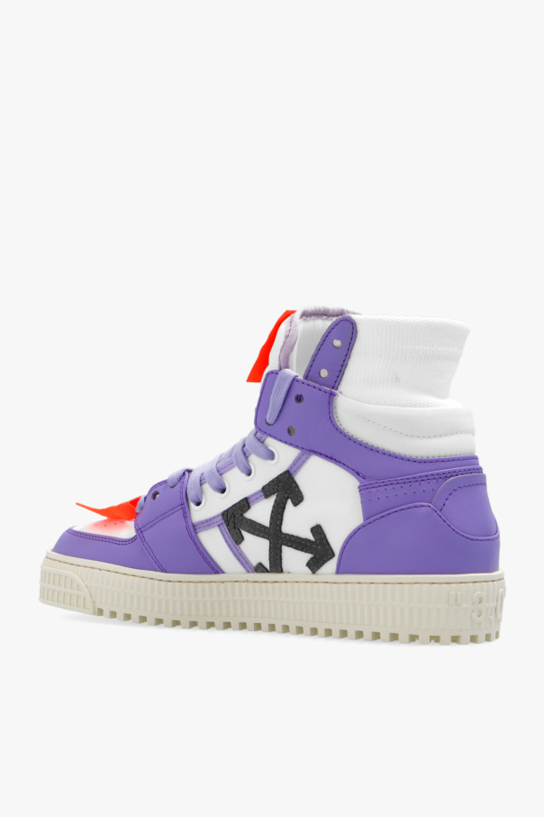 White and purple ‘3.0 Off Court’ high-top sneakers from Off-White. Trimmed with leather, this lace-up pair features neon yellow patches on the tongue, the brand's signature zip tie in dark green and rubber sole in cream.