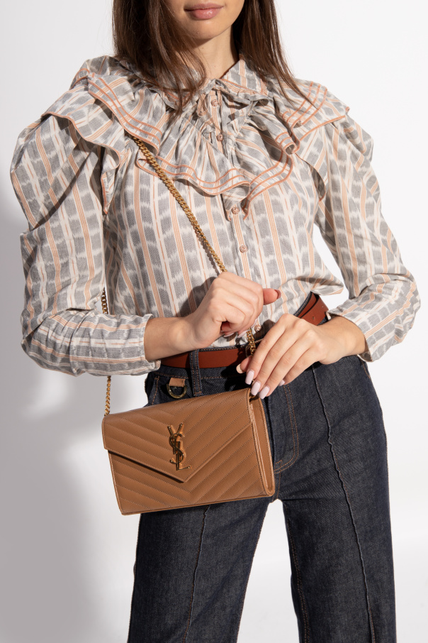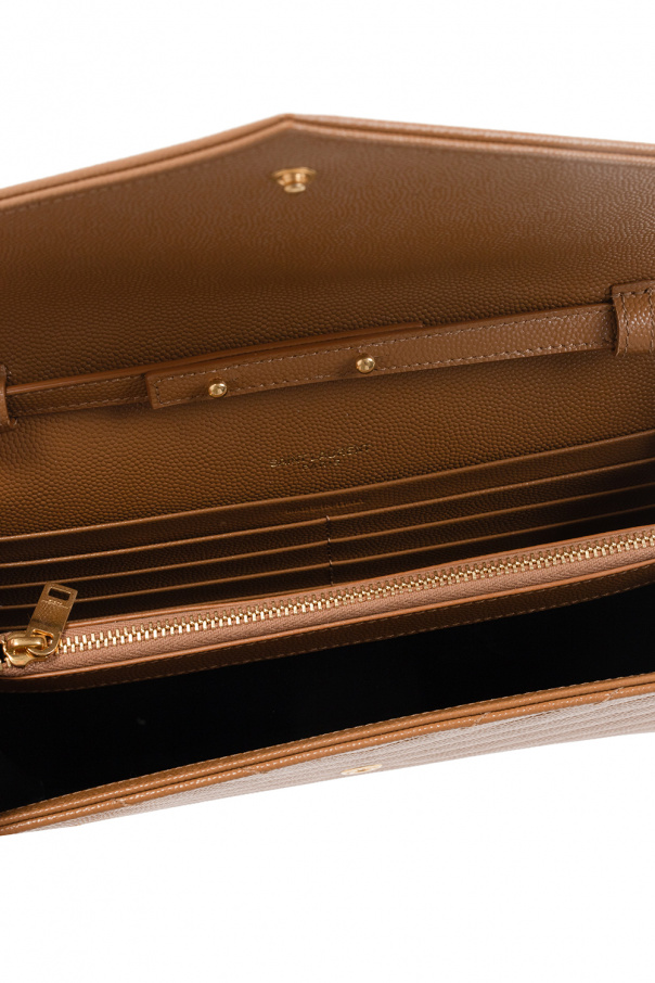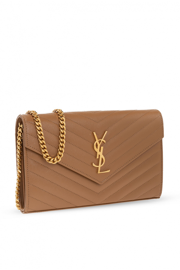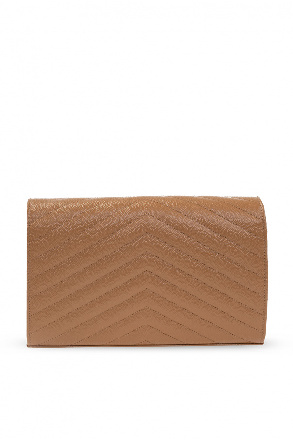 Brown ‘Monogram’ quilted shoulder wallet from Saint Laurent. Crafted from textured calf leather, this design fastens via a snap and showcases a metal logo on the front, gold-tone metal hardware and a black leather-clad interior with three compartments (one is zipped), one slip pocket and ten card slots.