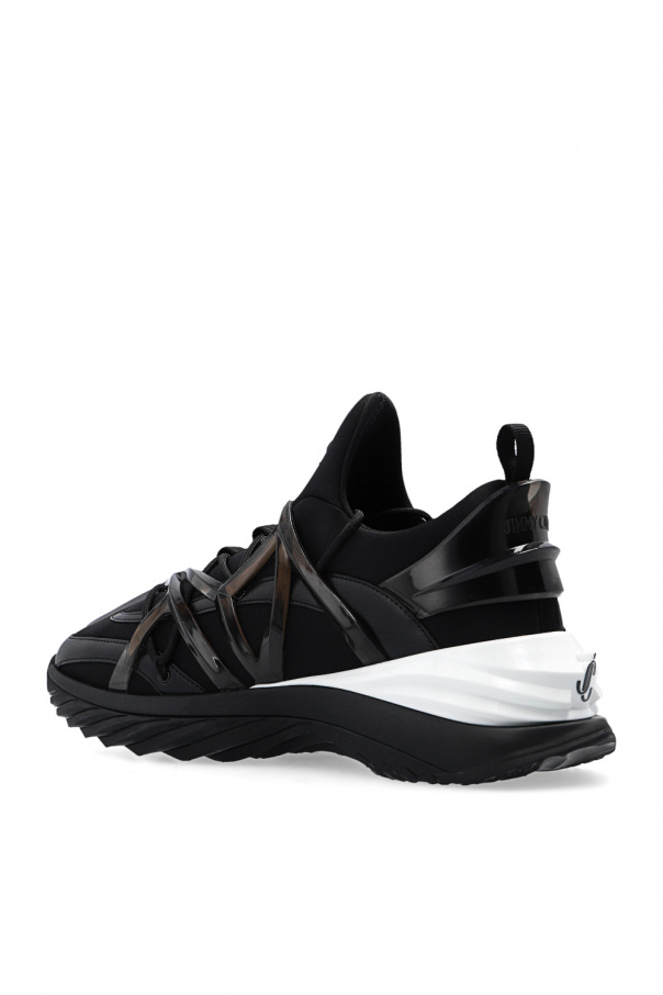 Black ‘Cosmos’ sneakers from Jimmy Choo. Made of neoprene and leather, this lace-up pair features decorative futuristic trims, raised logo, white heel counter and black rubber sole.