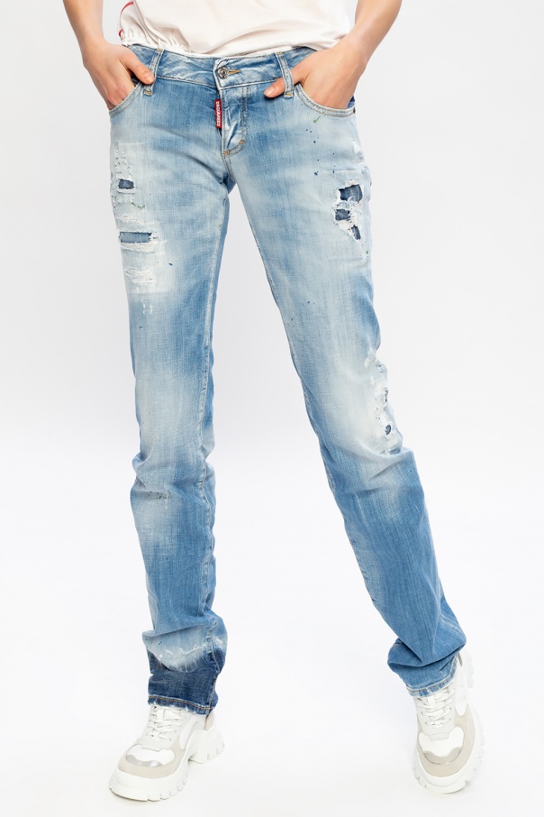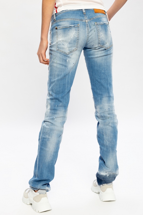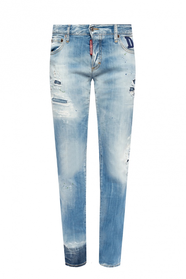 Blue 'Anniversary Jean' jeans from Dsquared2. Flaunting D2 logo rendered in navy blue embroidery, exposed yellow seams and the Canadian duo's iconic colourful paint splatters, this pair falls down with tapered legs with raw edges and employs button closing and classic five pockets.