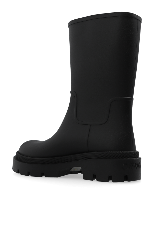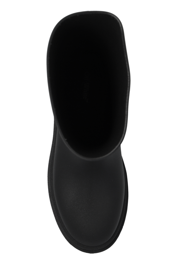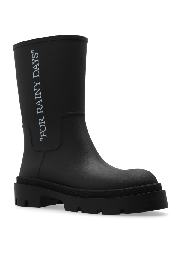 Introducing the Buty z nadrukiem from the esteemed house of Off-White, an epitome of modern elegance and functionality. These black rain boots, crafted from premium rubber, boast a sleek and minimalist design that seamlessly merges style with practicality. The boots feature a classic, mid-calf silhouette with a thick, textured sole, ensuring superior anti-slip properties ideal for rainy days. The side of the boots is adorned with a distinctive white print reading "FOR RAINY DAYS," adding a unique touch that is synonymous with Off-White's avant-garde aesthetic. Additionally, the designer's logo is subtly placed on the lower back of the boots, a testament to their authenticity and exclusivity. The rubber construction guarantees waterproof durability, making these boots a reliable companion for inclement weather. The absence of visible external seams and the smooth upper edge not only contribute to the boots' modern and streamlined appearance but also enhance comfort during wear. Embrace the sophistication of these black rain boots that effortlessly complement a variety of outfits, making them a versatile addition to any wardrobe. Off-White continues to capture the essence of contemporary culture, appealing to those who defy convention and seek individuality. Why Choose This Product? Elegant Design: Classic mid-calf shape with a sleek, minimalist look. Distinctive Print: Unique "FOR RAINY DAYS" print in white. Superior Comfort: Smooth upper edge and no visible seams. Durability: Made from high-quality rubber for waterproof reliability. Exclusive Brand: Authentic Off-White product with discreet logo placement.