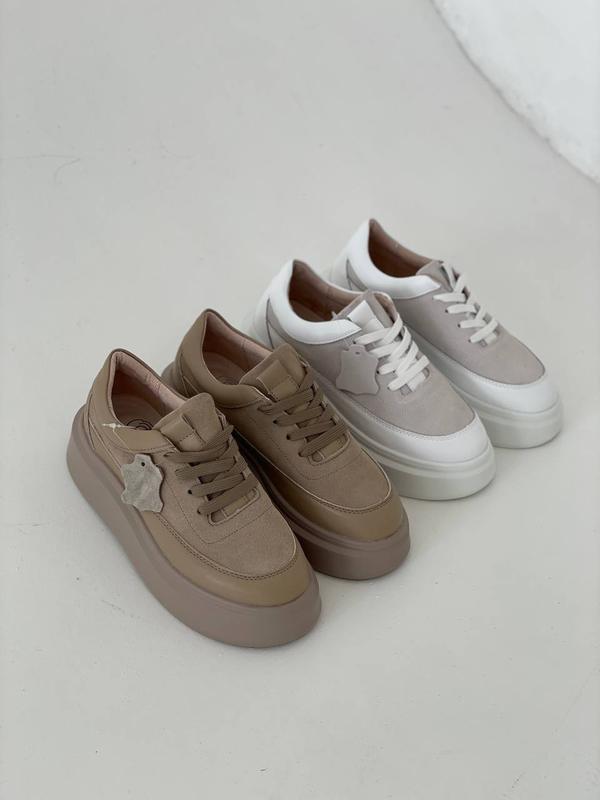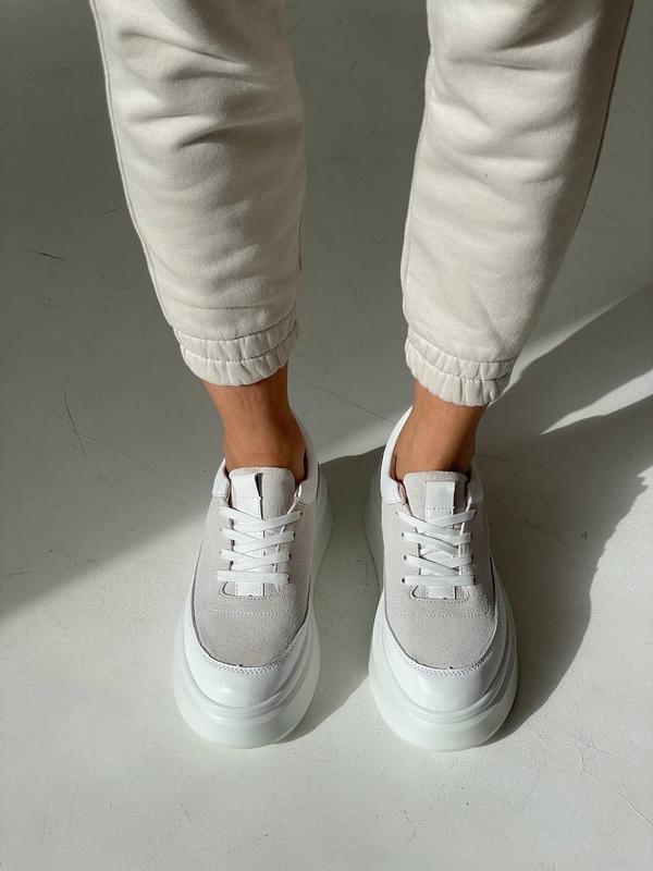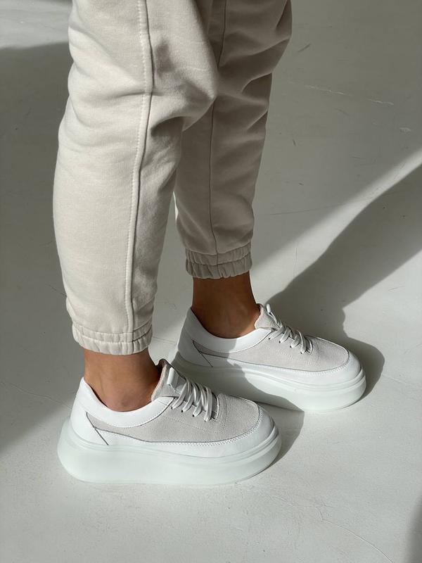 Білі масивні кеди з натуральної шкіри зі вставками натуральної замші