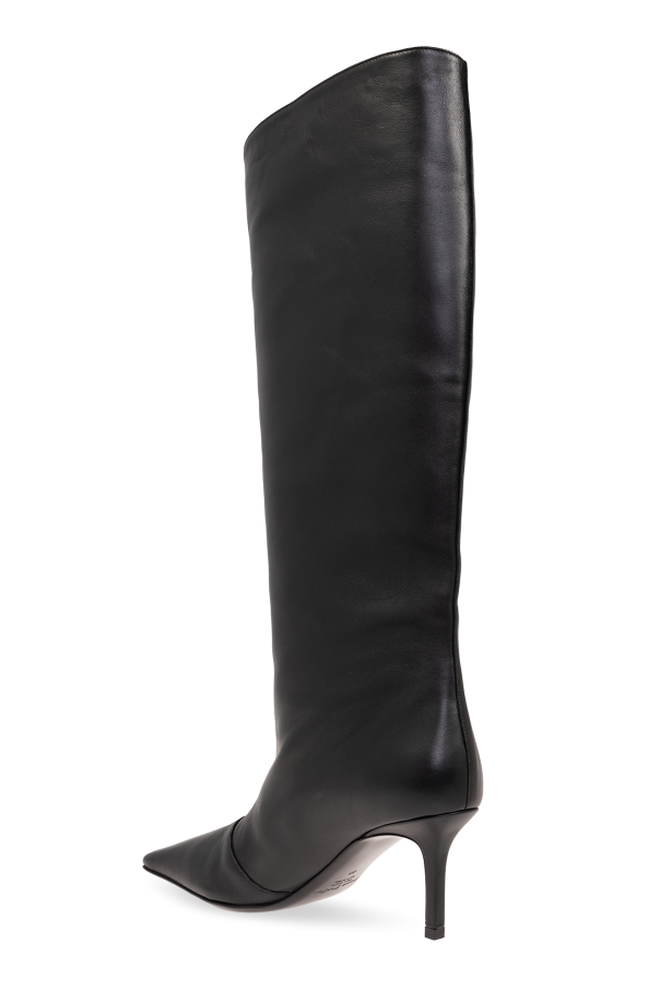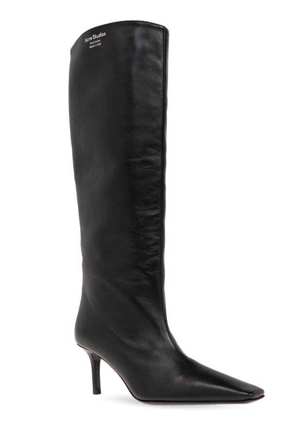 Black heeled boots from Acne Studios. Made of leather with a slip-on silhouette, this model sits on a black sole in leather and rubber sole and showcases an embossed logo on the side and an elongated square toe.