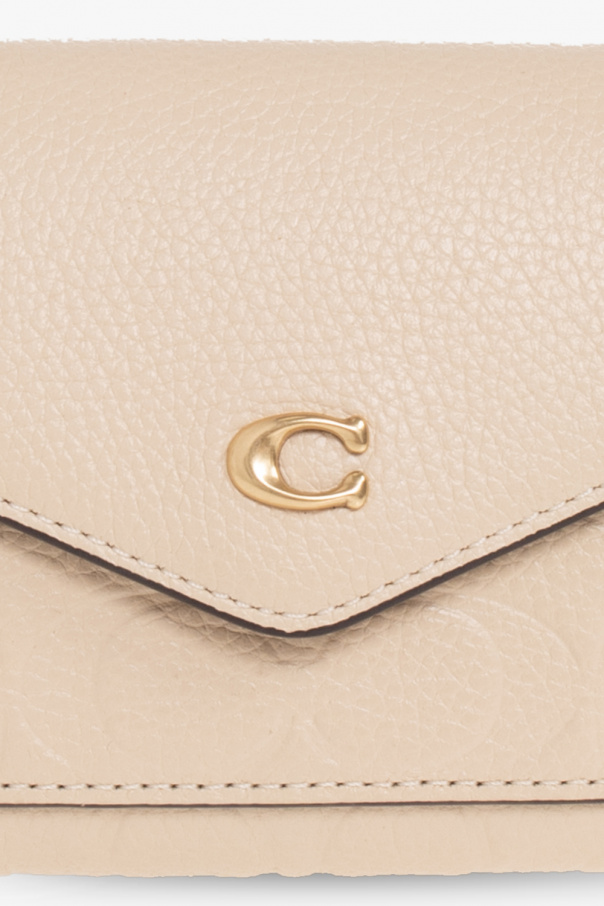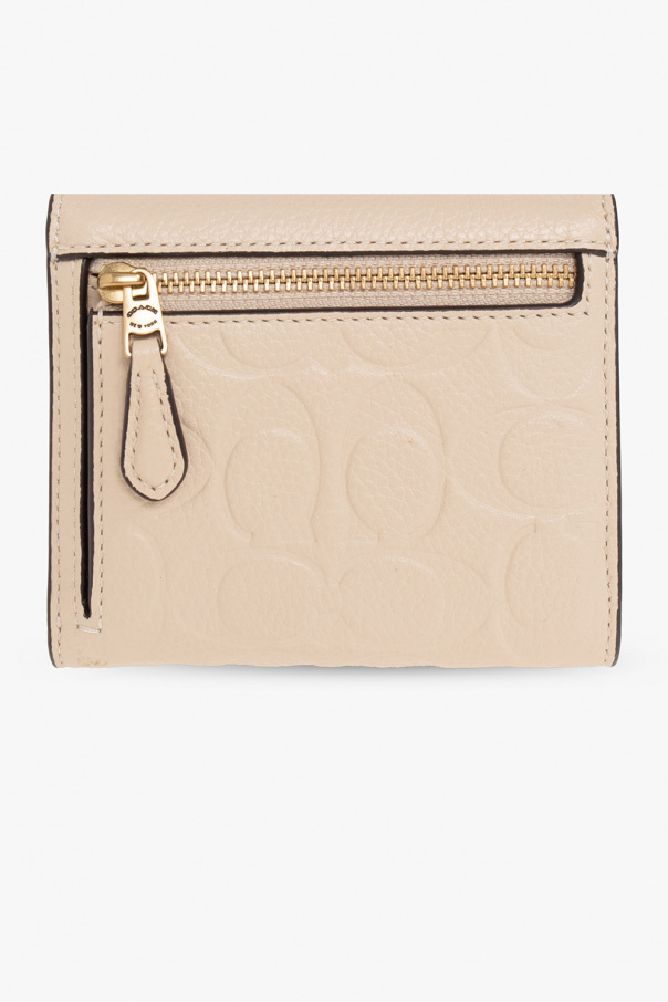 Cream ‘Wyn‘ wallet from Coach. Crafted from grained leather, this item features an embossed monogram, snap closure, metal logo appliqué in antique gold-tone and zipped coin pocket at the back. It has three slip pockets, one bill compartment and seven card slots inside.