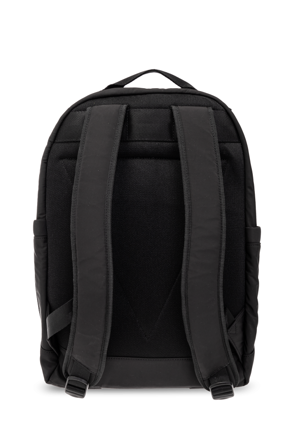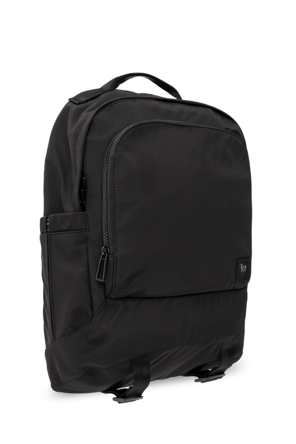 Black backpack from PS Paul Smith. Made of recycled fabric, this model features a two-way zip, logo patch on the front, zip pocket, two slip pockets, half-round handle, adjustable shoulder straps, black metal hardware and one internal compartment with one zip pocket and one slip pocket.