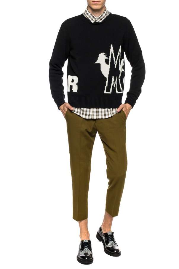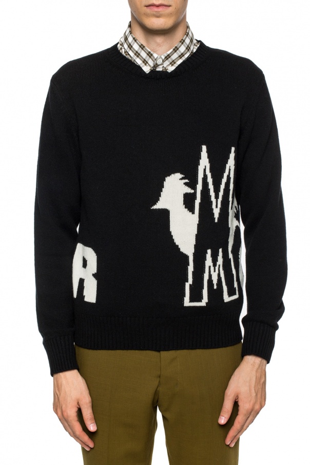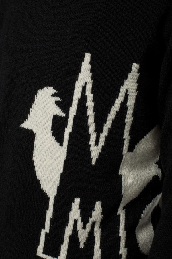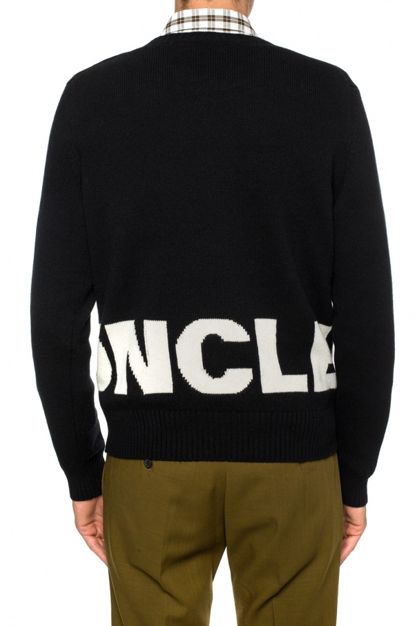 Black sweater from Moncler. Made of wool. Trimmed with cashmere. Decorated with a white logo embroidery. Round neck. Long sleeves. Elasticized bottom hem and cuffs.