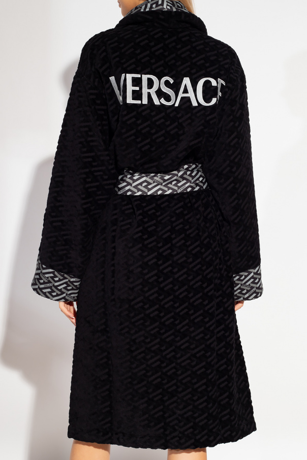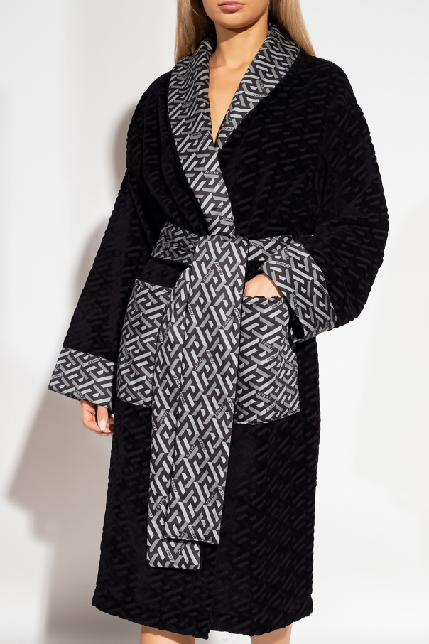 Black bathrobe from Versace Home. Crafted from cotton, this style features an embroidered grey La Greca pattern accompanied by a logo, two slip pockets, a belted waist, two slip pockets and long sleeves.