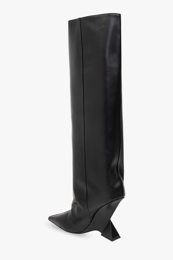 Black ‘Cheope’ knee-high boots from The Attico. Crafted from leather with a slip-on silhouette, this model sits on a black leather sole and features a pointed toe and a decorative wedge.