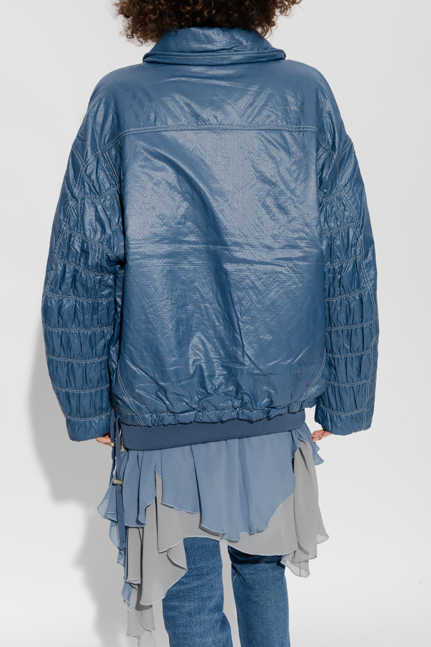 Dark blue ‘G-ELEU’ jacket from Diesel. Crafted with an oversize fit, this style features a two-way zip fastening, two zip pockets on the front, long sleeves with gathers and a drawcord-adjustable hem with a chiffon ruffle in grey and blue.