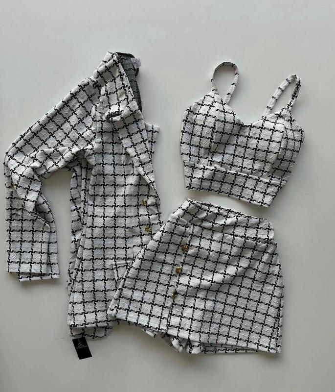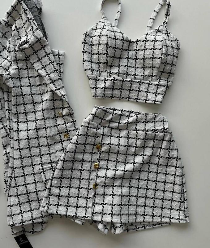 🔘Цена - 1180 грнКлассический костюм тройка из удлиненного слегка приталенного пиджака, топа и юбки - шорты. Пиджак застегивается на пуговицы, топ на лямках и спинка на резинке, шорты на молнии. Фурнитура золото. Плотная качественная ткань твид. Идеально подойдет, как на выход, так и на повседневный. Вещи можно отлично сочетать с другими вещами вашего гардероба. Пиджак идет без подклада