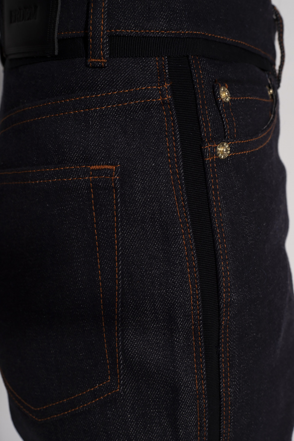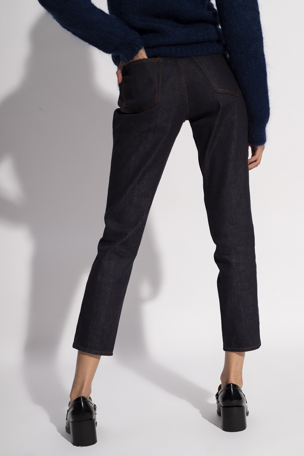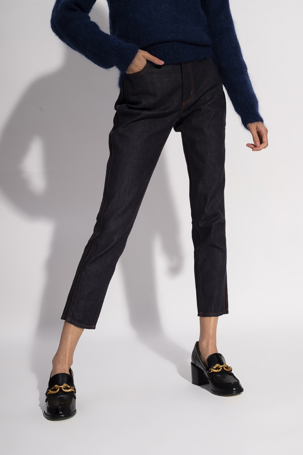 Navy jeans from Erdem. Fastened with a zip and button, this pair falls down with tapered legs and is complete with a black logo-embossed patch at the back and stitching details one the sides.