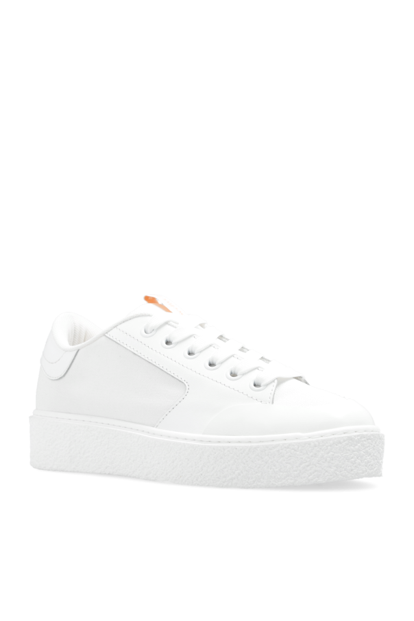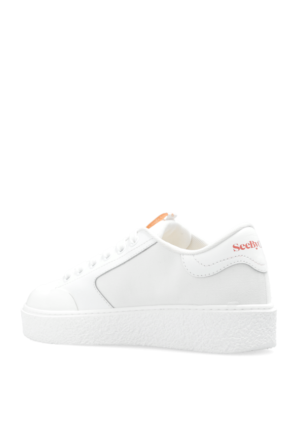 White and cream ‘Hella’ sneakers from See By Chloé. Made from leather with canvas trim, this lace-up model sits on a white rubber sole with a distinctive texture and showcases the brand's logo on the heel counter.
