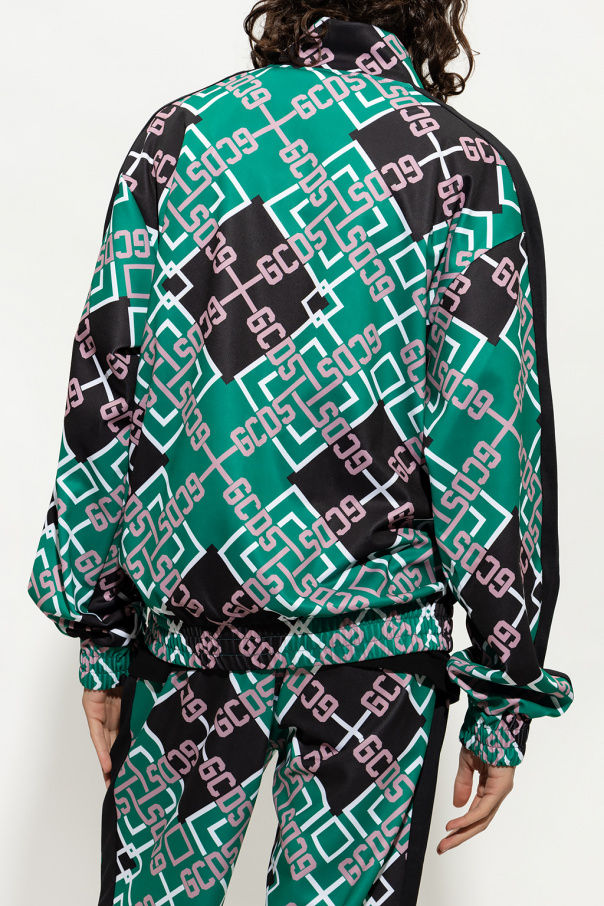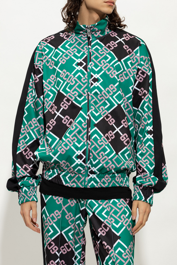 Green and black sweatshirt with a stand collar from GCDS. Fastened with a zip, this long sleeve design features a pink monogram pattern, white geometric pattern, two slip pockets and ribbed trims at the hem and cuffs.