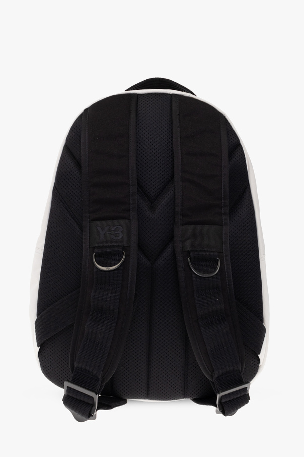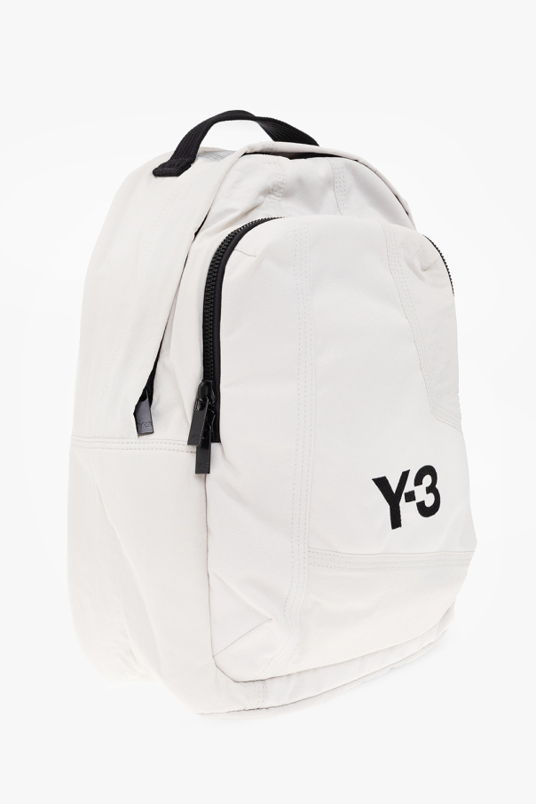 Light grey backpack from Y-3 Yohji Yamamoto. Crafted from recycled materials, this design fastens with a two-way zip, and is decorated with a black logo embroidery. It has a front zip pocket with an internal slip pocket, half-round handle, adjustable shoulder strap, black metal hardware and one internal compartment with one slip pocket and one zip pocket.