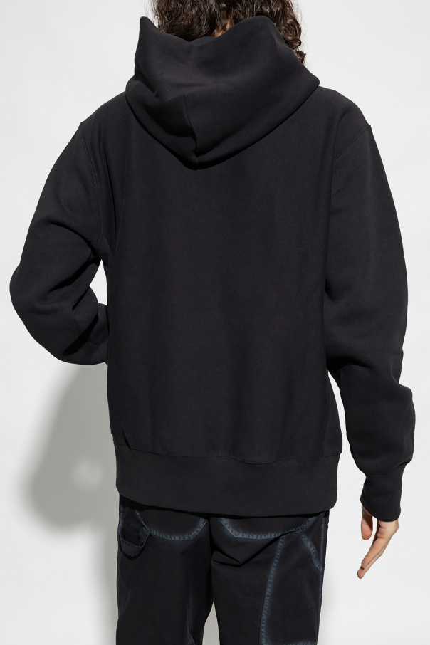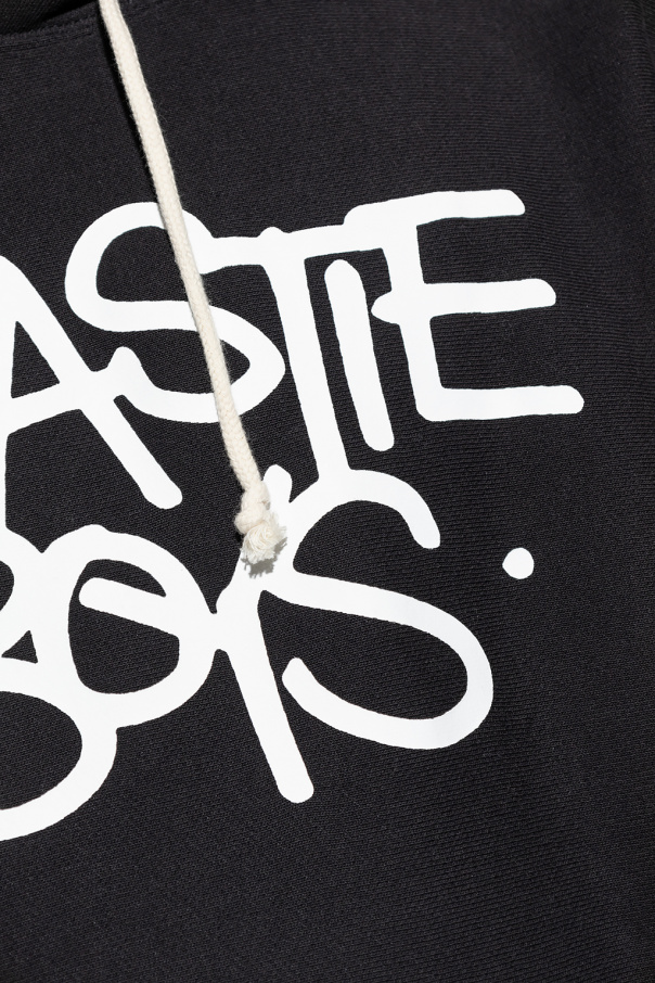 Black hoodie from Champion x Beastie Boys. Crafted from a cotton blend, this design features a drawstring hood, white Beastie Boys logo print, sleeve patch with a logo, slip pocket and ribbed trims at the hem and cuffs.