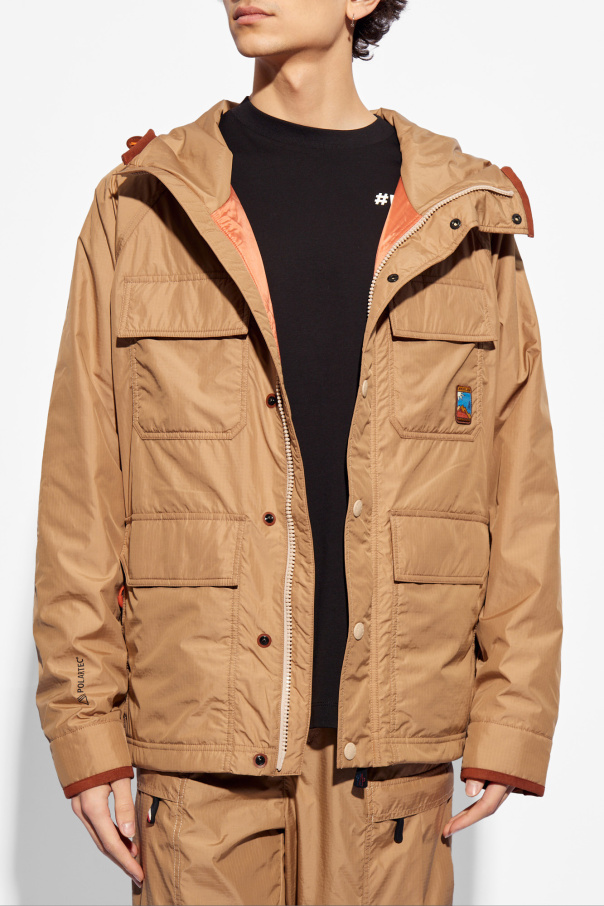 Beige ‘Rutor’ jacket from Moncler Grenoble, the ‘Day-Namic’ collection. Padded with Polartec® Alpha® insulation, this style fastens via a two-way zip and snaps and features a drawcord-adjustable hood, logo patches, two zip pockets, four velcro-fastened pockets with flaps and long sleeves with snap-fastened cuffs. The jacket offers waterproof, windproof and breathable properties.