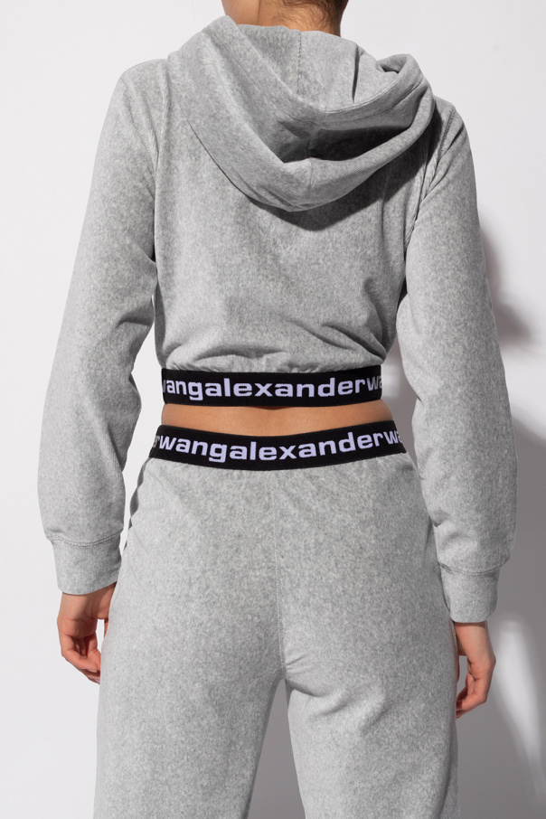 Grey sweatshirt with a drawcord-adjustable hood from Alexander Wang. Crafted from cotton jersey with a cropped silhouette, this hoodie features long sleeves and a black elasticated hem with a white logo.