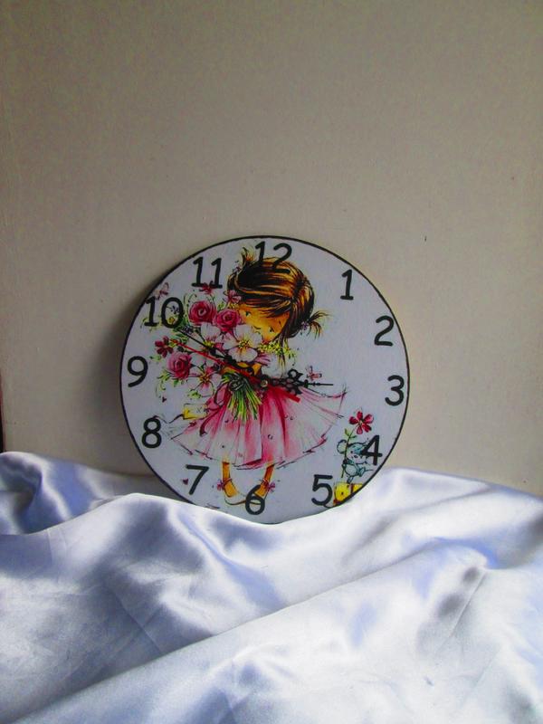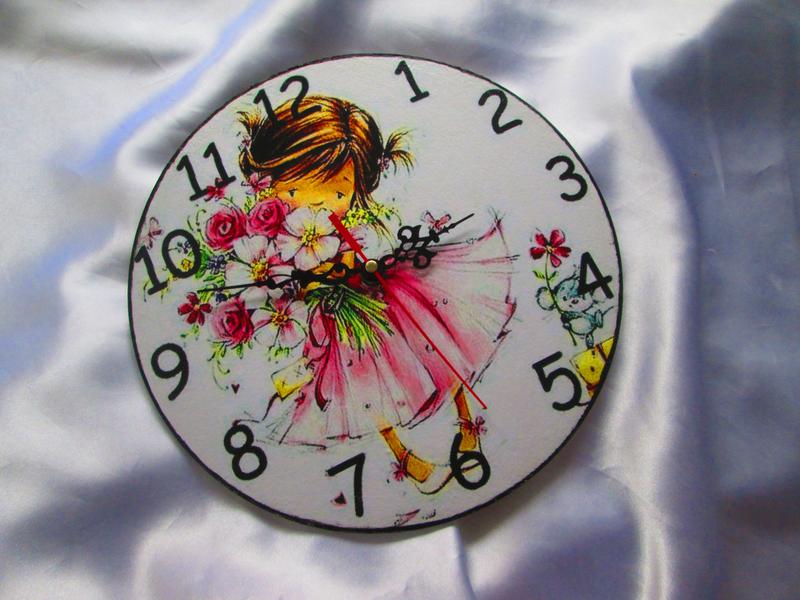 Настінний годинник 'Малюшка' готовий прикрасити дитячу кімнату маленьких принцес. Чудовий декор для Вашої оселі, ексклюзивний подарунок рідним. Подаруйте радісні хвилини Вашим близьким. Такий годинник стане красивим доповненням та прикрасою інтер'єру. Настінний годинник виконаний у техніці декупаж. Діаметр годинника 25 см. Основа - фанера або МДФ. Годинниковий механізм працює від пальчикової батареї (не комплектується батареєю). Всі матеріали, що використовуються в декоруванні годинників, на водній основі і безпечні для здоров'я.