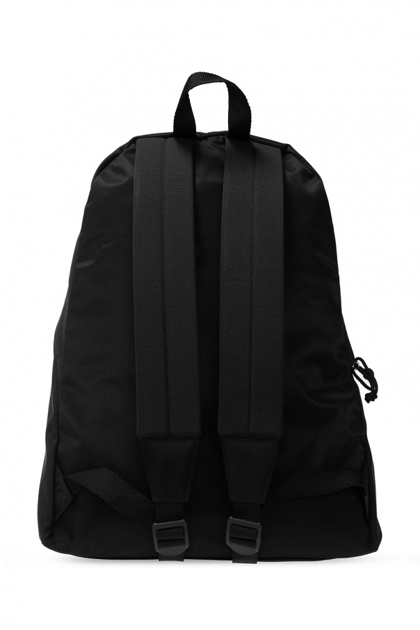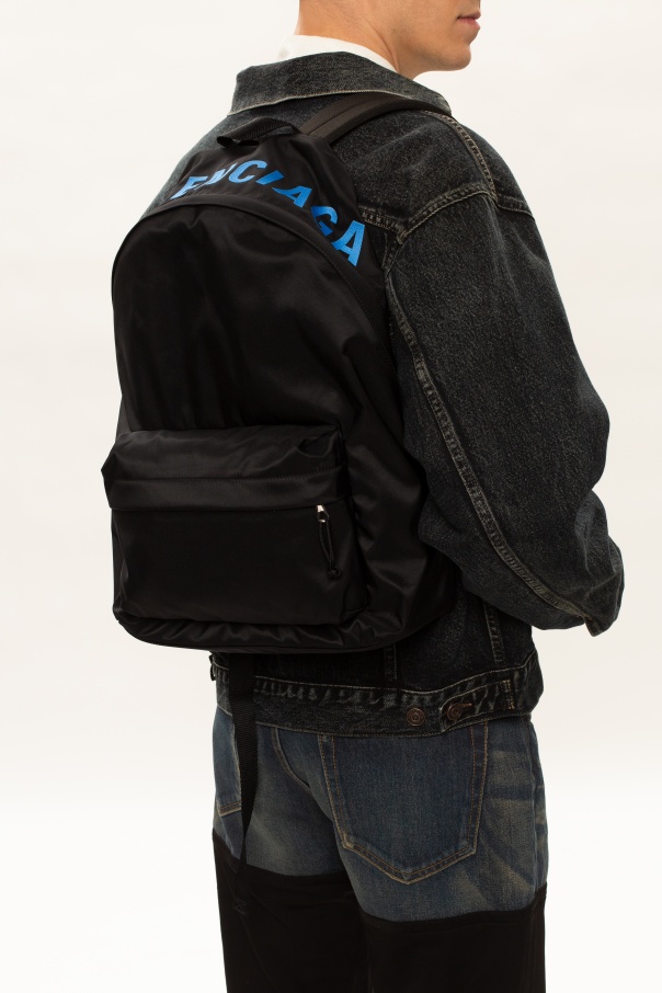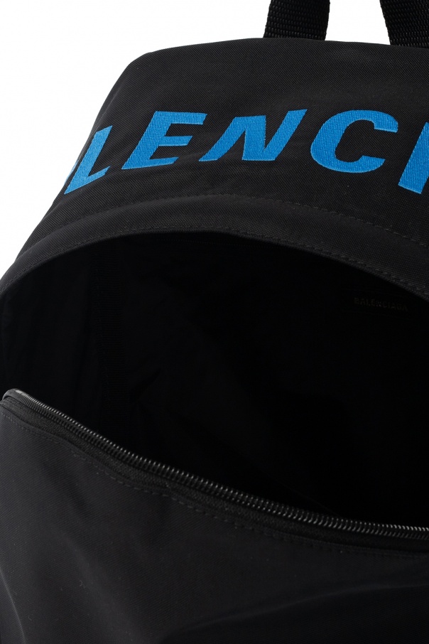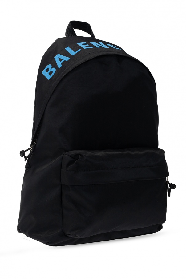 Black ‘Wheel’ backpack from Balenciaga. Fastened with a two-way zip, this model features a blue logo embroidery, front zip pocket, half-round handle, adjustable shoulder straps, silver-tone metal hardware and one internal compartment with one zip pocket.