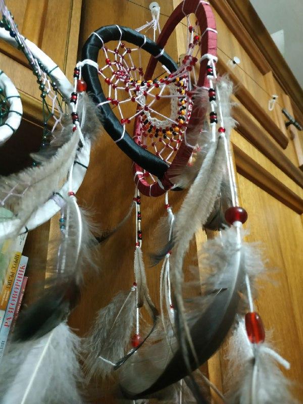 Материалы: деревянные основы, атласные ленты, нитки мулине, бусины, «живые» перья павлина, страуса.