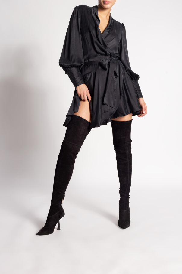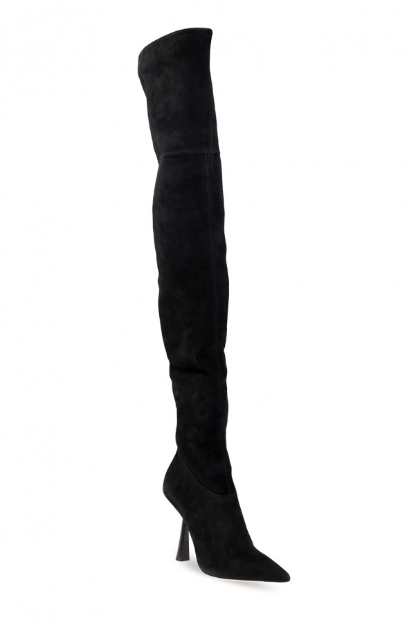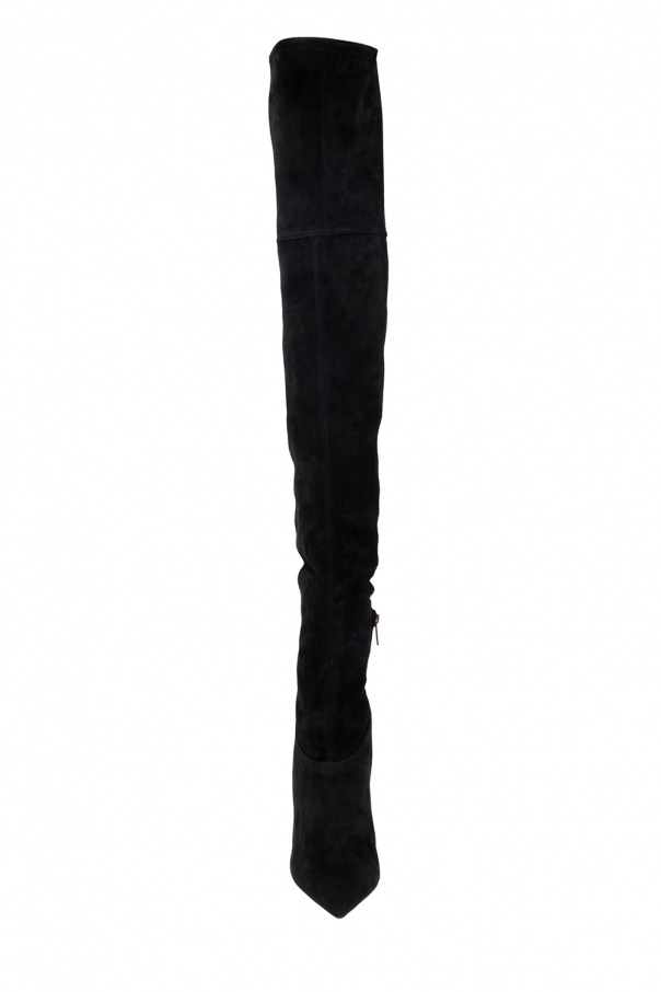 Black ‘Bryson’ over-the-knee boots from Jimmy Choo. Crafted from suede, this pointed toe silhouette is complete with a side zip fastening, metal logo in gold-tone and beige sole made of leather and rubber.