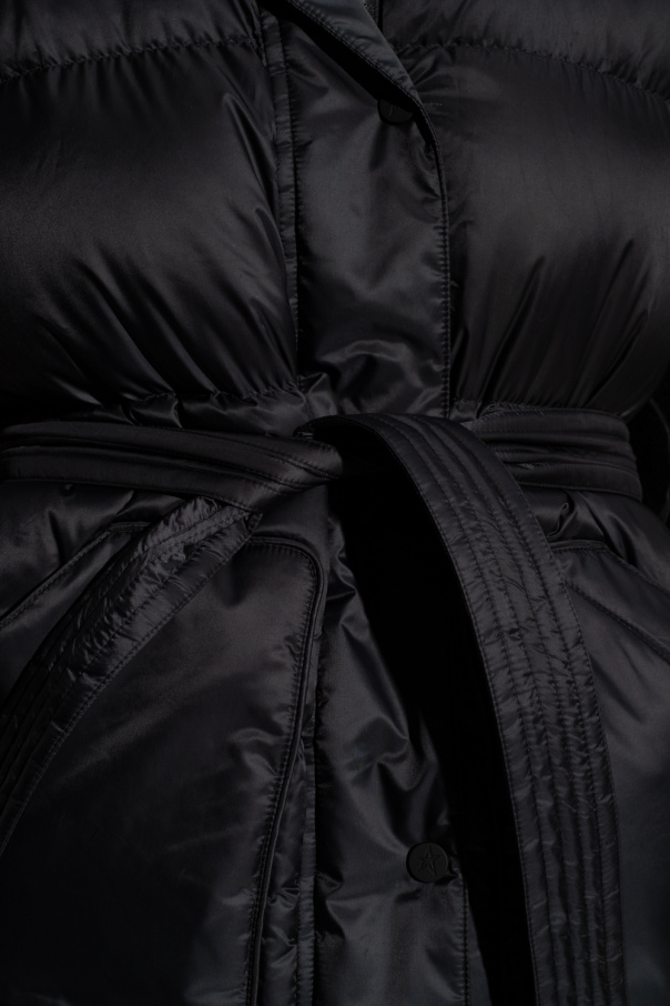 Navy blue vest from Perfect Moment. Padded with down, this style fastens with a zipper and snaps and features a waist-cinching belt, two zip pockets, a concealed hood and an embroidered red logo.