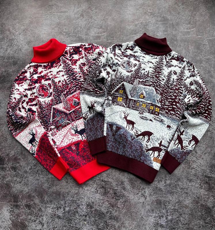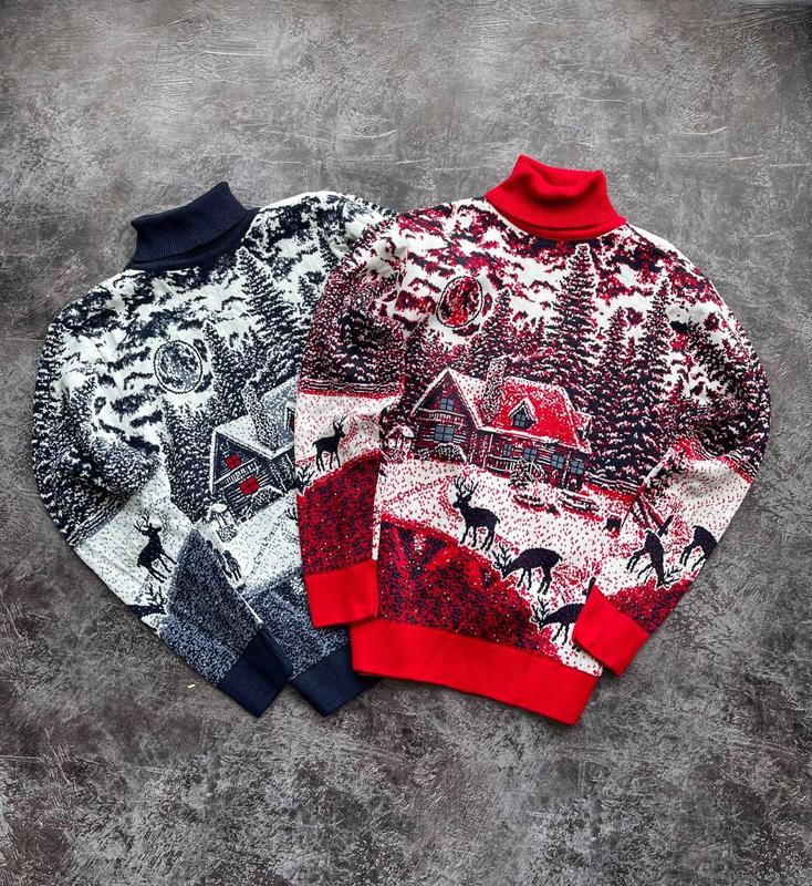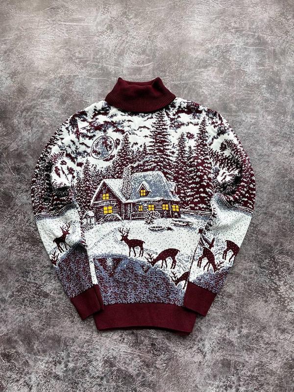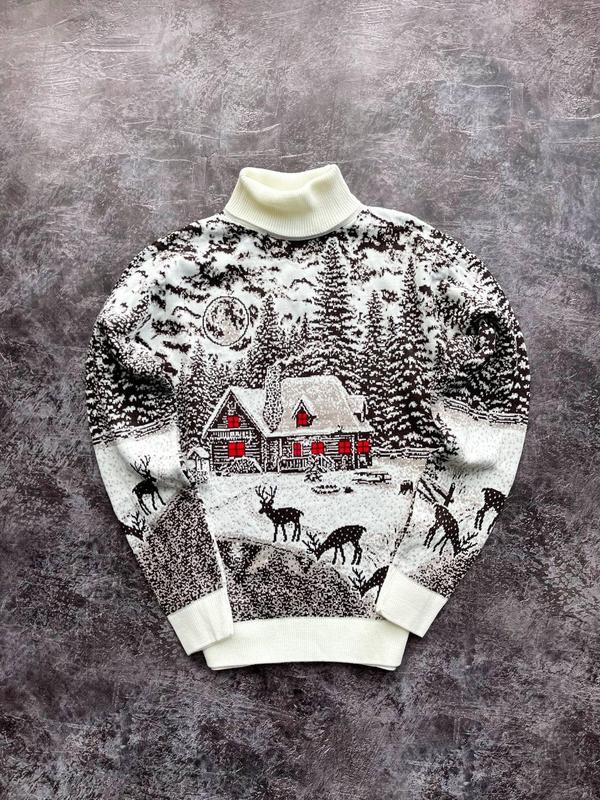 Мужской новогодний свитер с оленями и домиками с горлом шерстяной