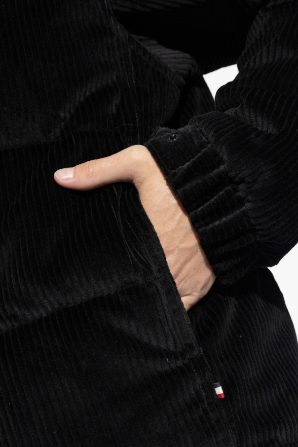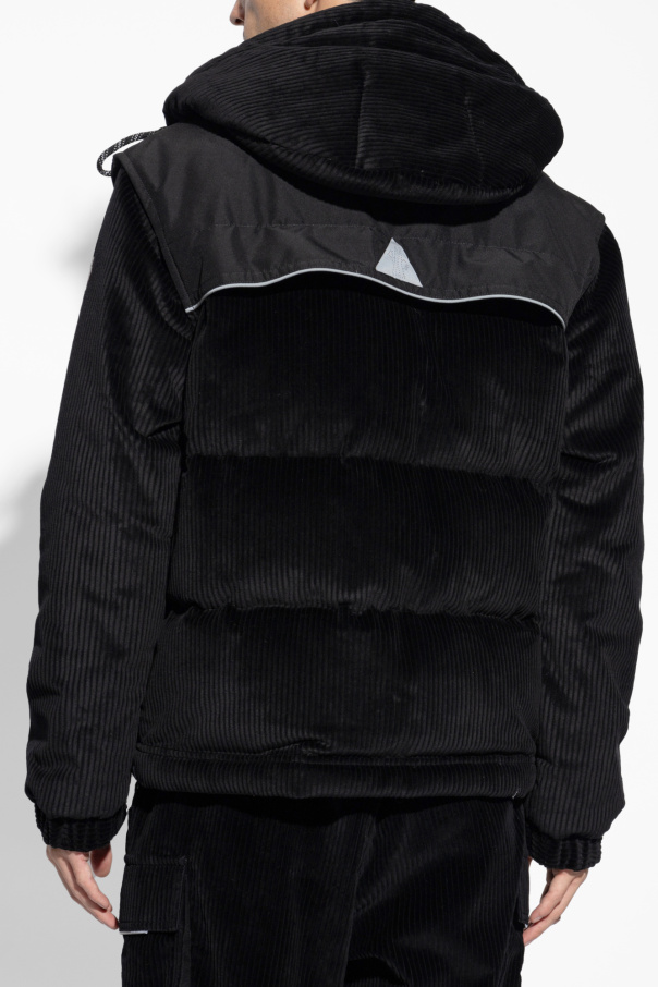 Introducing the Moncler Grenoble Apres-Ski Jacket, a quintessential piece from the exclusive Moncler Grenoble collection, renowned for its high-fashion approach to active menswear, particularly in the realm of ski apparel and accessories. This jacket epitomizes sophistication with its straight-cut silhouette and meticulously crafted details on the shoulders and hood. The exterior is fashioned from luxurious black corduroy, imparting a refined texture and aesthetic. The upper portion, including the hood, utilizes a contrasting material such as nylon or polyester, offering enhanced protection against the elements. The jacket features an array of thoughtful design elements: adjustable drawstrings on the shoulders and hood for a tailored fit, and striking white piping on the upper section that adds a distinctive flair. The front closure is secured with buttons, and a discreet "MONCLER" logo is embossed on the chest. Additionally, a small branded tag is subtly sewn into a side pocket. For added functionality, the jacket includes a hood for rain and snow protection, elasticated cuffs to guard against the cold, and a reflective element on the back, ensuring safety during winter sports activities. The dominant black hue enhances its timeless appeal. Why Choose This Product? Crafted from high-quality materials: corduroy, nylon, and polyester. Elegant design with functional details for an impeccable fit. Includes a hood and elastic cuffs for optimal weather protection. Subtle yet iconic Moncler branding. Reflective element for increased safety.
