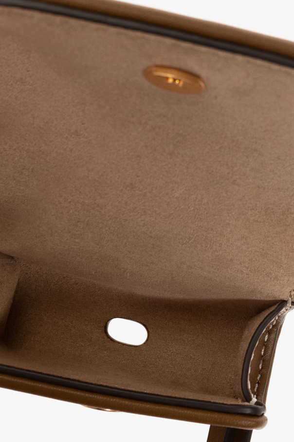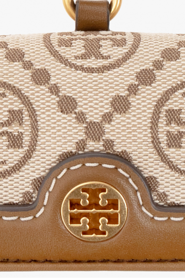 Brown and cream AirPods Pro case from Tory Burch. Crafted from canvas with a jacquard T Monogram pattern inspired by traditional Pennsylvania Dutch quilting, this item is complete with a magnetic snap button, metal Double T appliqué, strap with a carabiner hook and gold-tone metal hardware.