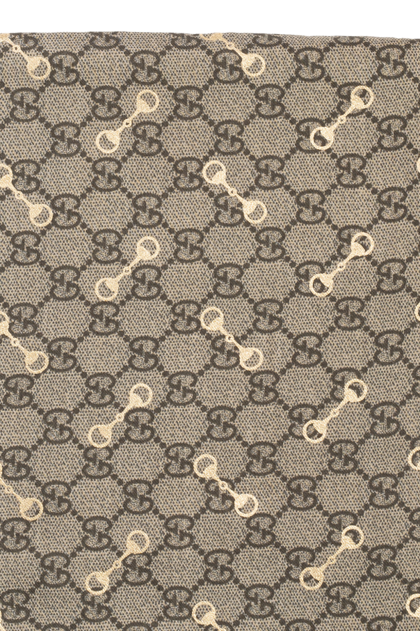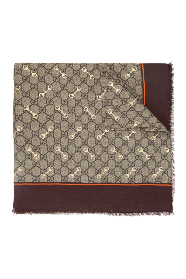 Beige, brown and orange scarf from Gucci. This design features a gold-tone GG print and raw cut edges.