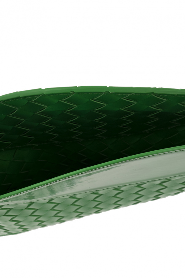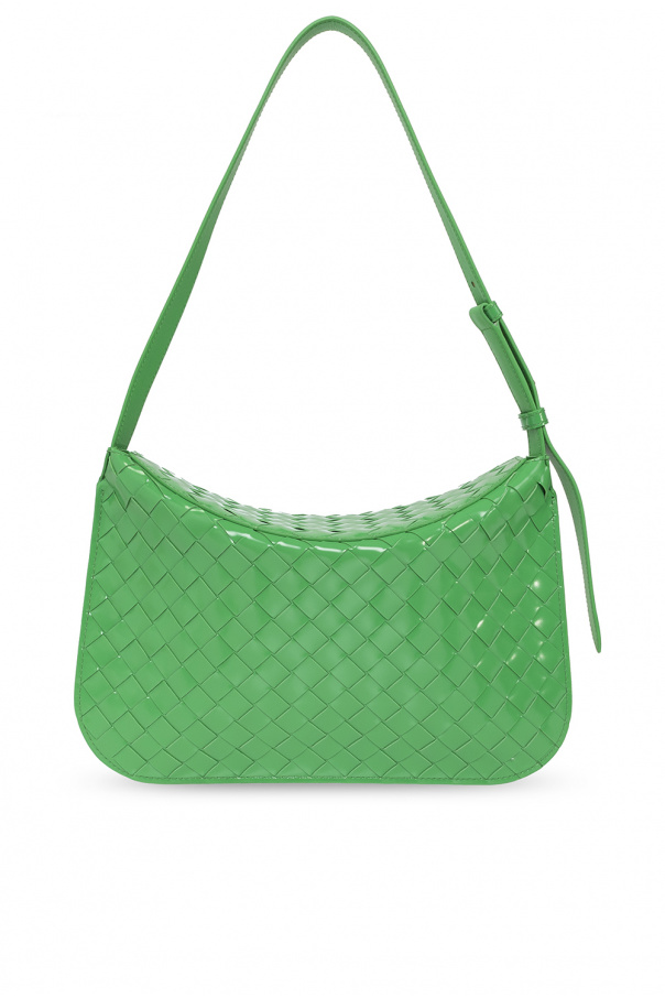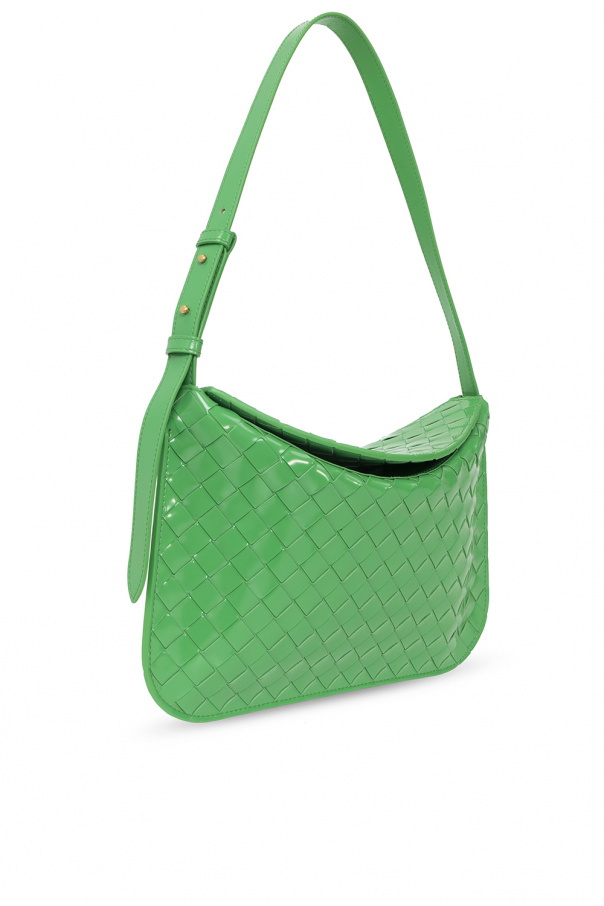 Green ‘Flap Small’ shoulder bag from Bottega Veneta. Crafted from calf leather, this model features a flap, the brand’s signature Intrecciato weave, adjustable shoulder strap, one internal compartment and antique gold-tone metal hardware.
