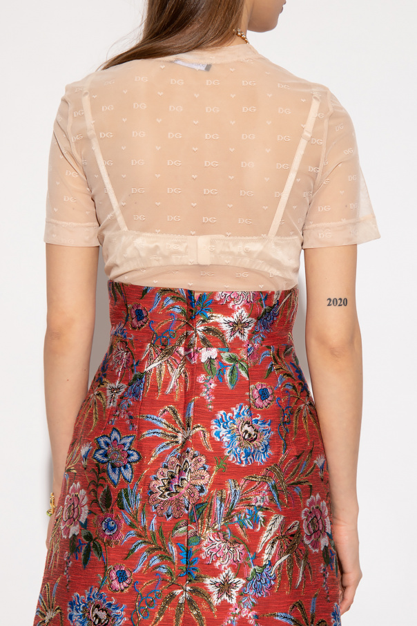 Light beige crewneck T-shirt from Dolce & Gabbana. Made of tulle with a semi-sheer finish, this style features short sleeves and an embroidered logo.