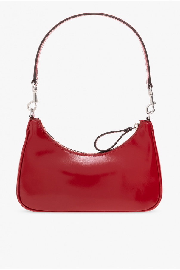 Red ‘Mercer Small’ shoulder bag from Tory Burch. Crafted from glossy leather, this design features a zip fastening, ‘Double T’ hardware on the front, a detachable handle and short chain, an adjustable shoulder strap in brown nylon, silver-tone metal elements and one internal compartment with two card slots.