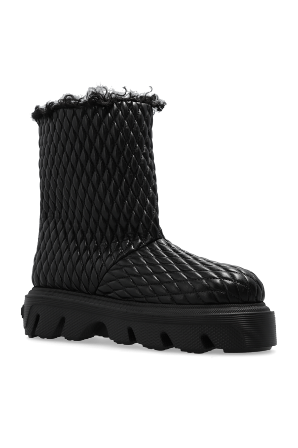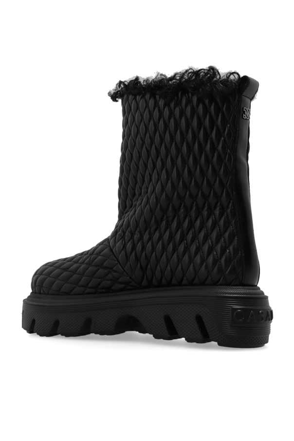 Black quilted snow boots from Casadei. Crafted from leather with fur trims, this pair features a logo and a black rubber sole.