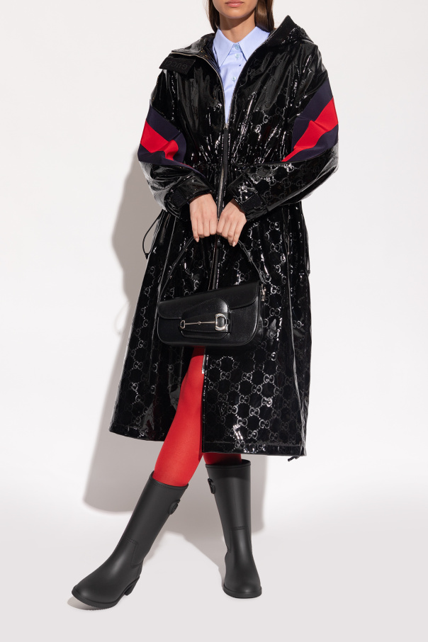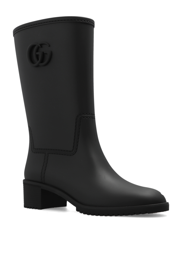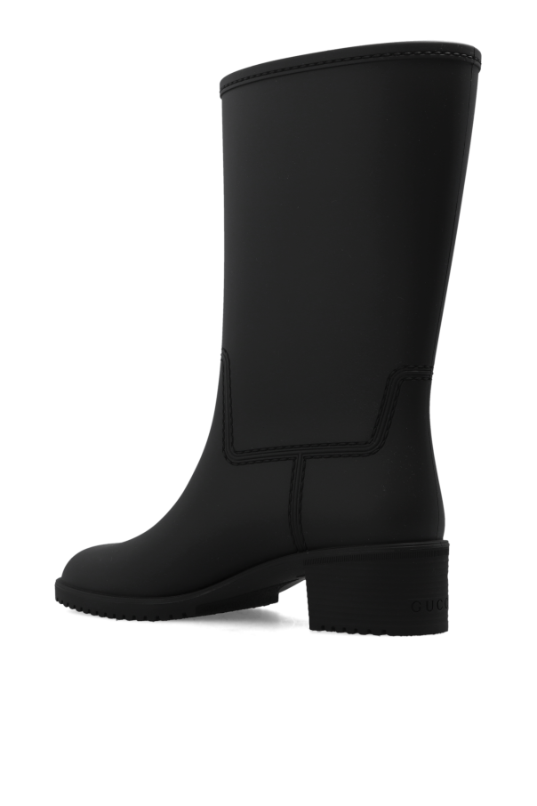 Black heeled rain boots from Gucci. Sitting on a black rubber sole, this model showcases a tactile logo on the side.